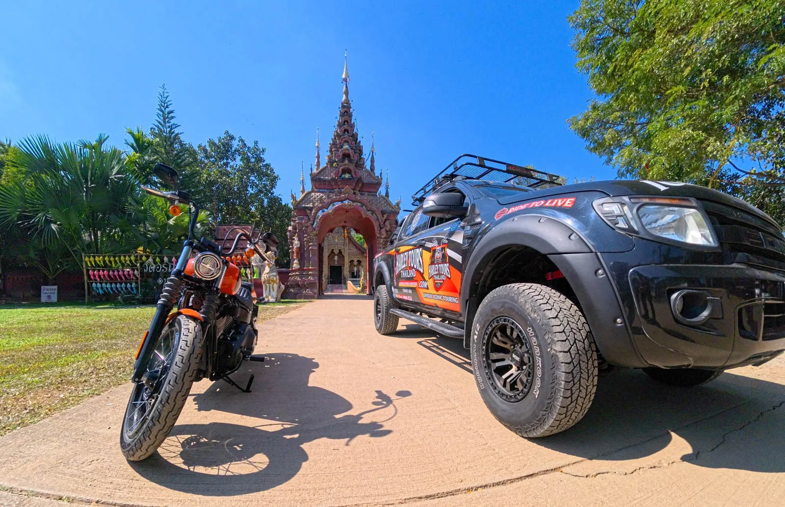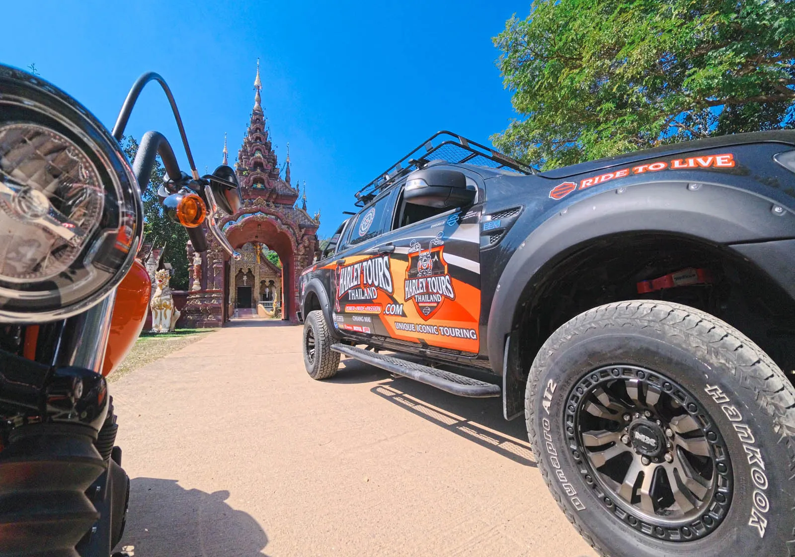 We operate a Ford Ranger 4-door 4WD, fully branded in Harley Tours Thailand graphics and purpose-built to support our riders on every kilometre of the journey.